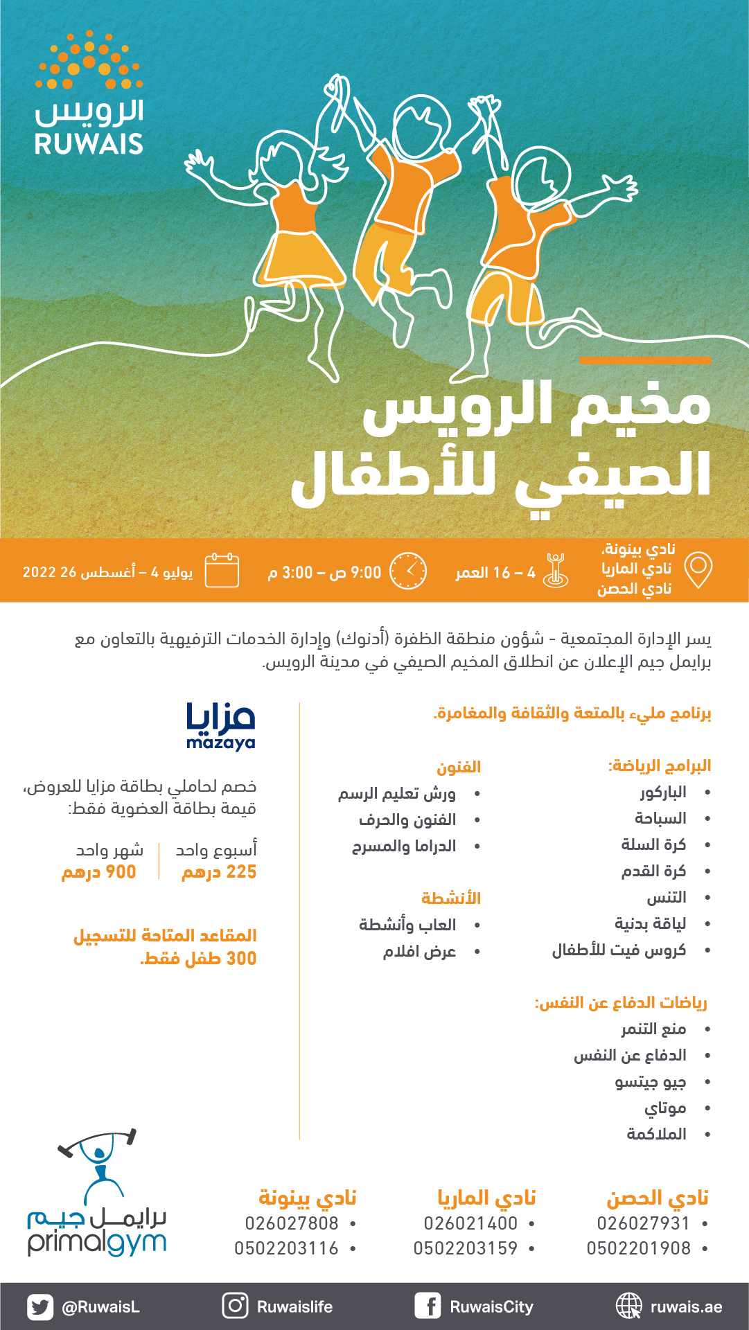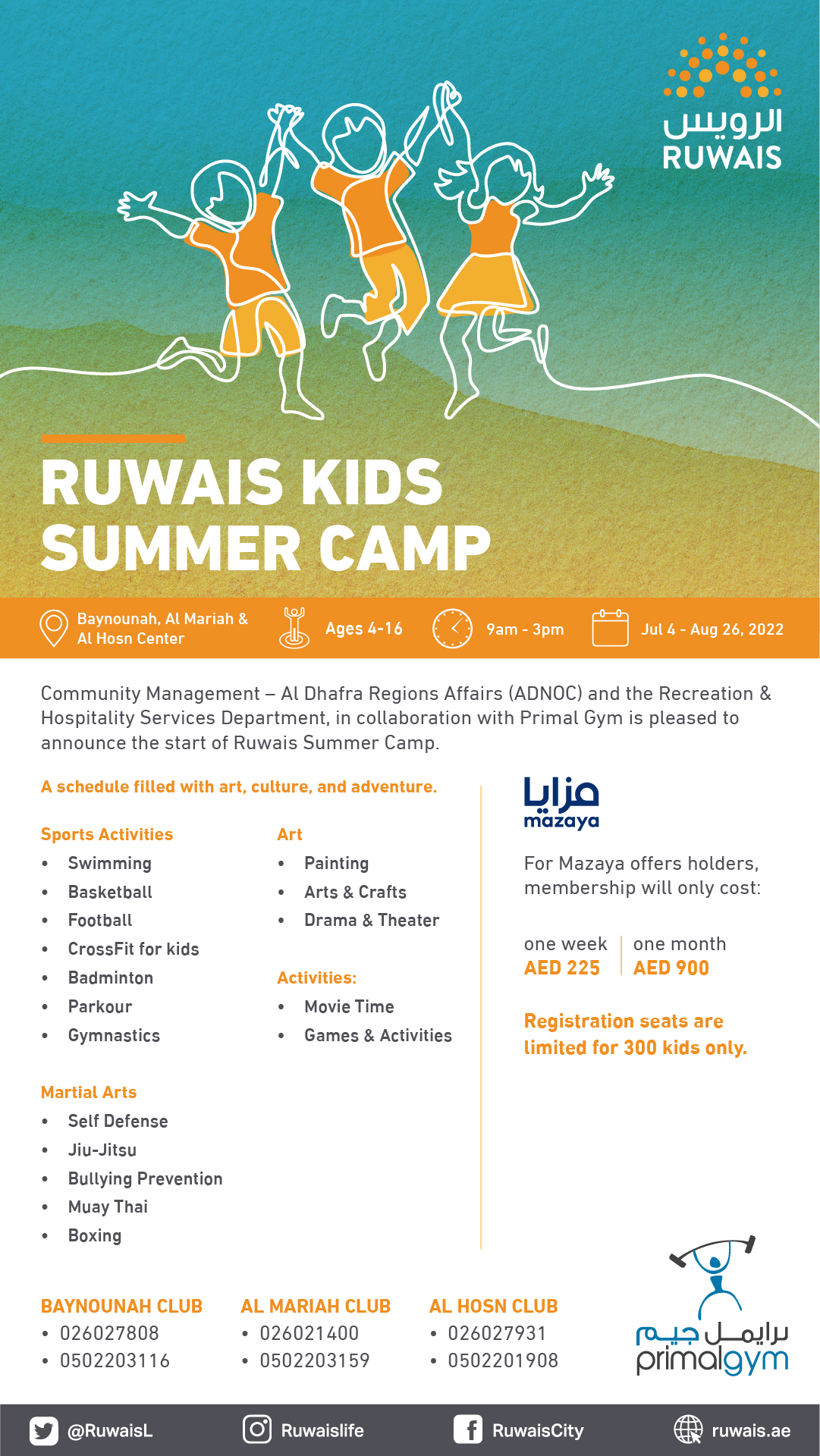 Community Management - Al Dhafra Region Affairs (ADNOC) and the Recreation & Hospitality Services Department, in collaboration with Primal Gym is pleased to announce the start of Ruwais Summer Camp.